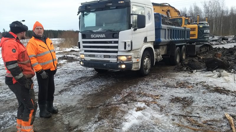 Työt etenevät ripeästi, sillä läjitysalueelle kertyvästä vedestä huolimatta maaperä kantaa niin hyvin, että kaivuumaita päästään siirtämään traktorin sijaan kuorma-autolla.