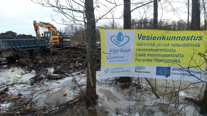 Talven suurin kosteikkotyömaa on valmistumassa Aitoon Tevunlahdelle. Myllyojan suulle on kaivettu talven aikana hehtaarin kokoinen kosteikko, jossa vesi viivähtää ja sen mukanaan kuljettama ravinteikas aine laskeutuu ennen Jouttesselkää.