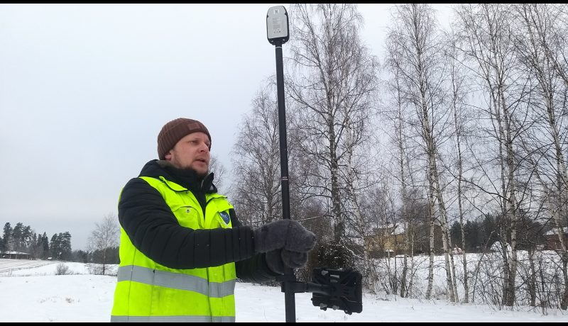 Hän tökkäisee gps-mittarin varren pellon alavimpaan kohtaan. Mittaustuloksen perusteella voi varmistaa, että laserkeilauksen ja muun aineiston korkeustiedot vastaavat todellisuutta. Myös ojasta löytyy sula virtauskohta, josta saa mitattua pohjan ja pinnan korkeudet.